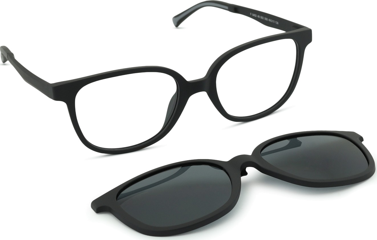 Súčasťou okuliarov je aj prídavný slnečný klip, ktorý sa ľahko pripne k okuliarovej obrube a ihneď tak získate slnečné okuliare. Klip svojim prevedením a dizajnom výborne kopíruje tvar rámu a jeho inštalácia je veľmi rýchla a jednoduchá. V prípade vyšších plusových dioptrií je však nutné voliť stenčený variant okuliarových šošoviek, aby sa klip nedotýkal prednej sférickej plochy šošoviek a na ráme tak správne sedel.